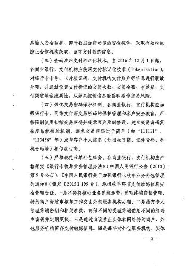 2016年12月1日起全面实行支付技术标记化处理支付机构应使用支付标记化技术,,,对银行卡卡号、、、卡片验证码、、、支付机构支付账户等信息进行脱敏处理,,,并通过设置支付标记的交易次数、、、交易金额、、、有效期、、、支付渠道等域控属性,,,防范交易风险!